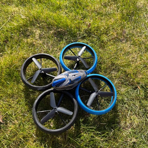 Sort drone med sammenklappelige arme og fjernbetjening med joysticks. Ligger i en hård taske med formstøbt indlæg til drone og dele. Det er camera man skal hente en app få at bruge cameraet