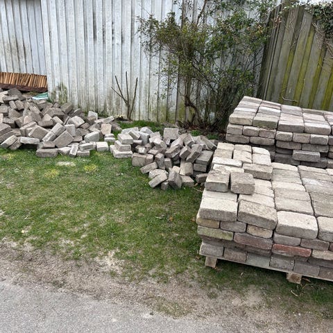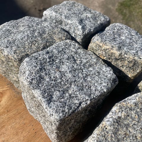 Mindst 15 m2 chaussesten i granit. Måler i snit ca 10x10x10 cm. Forskellige nuancer som vist på billede.