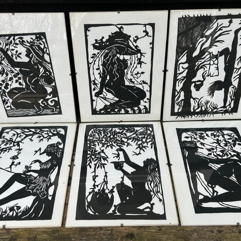 Sæt med 5 vintage smørebrætter med klassiske sort/hvide Bjørn Wiinblad‑motiver i silhuetstil. Produceret for Schulstad, formentlig i slut‑60’erne/70’erne.