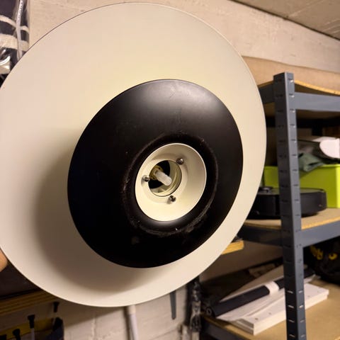 Stor grå udendørs lampe med mast med rundt lampehoved og klar skærm. Har 2 af hver. Sælges 1500 kr. pr. Stk.