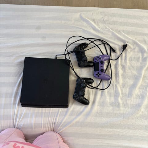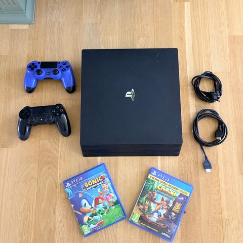 Playstation 4 sort konsol fra Sony. Med sort DualShock controller og tilhørende kabel (strøm og HDMI) som på billederne.