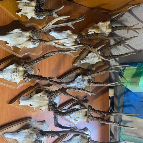 13 stk bukkeopsatser, monteret på samme størrelse trofæ plade, men med forskellige størrelser gevirer.
