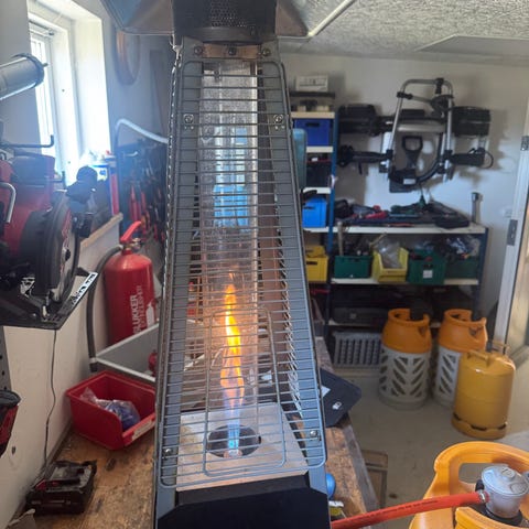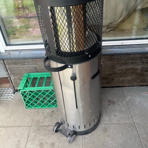 Terassevarmer med indbygget lys, og skjuler til gasflasken, i grøn farve.