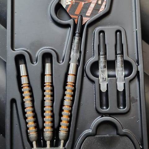 Samling af dartpile med forskellige flights og skafter i en praktisk opbevaringskasse med ruminddeling. Der følger også ekstra flights, spidser og smådele i poser, så der er lidt at skifte imellem.