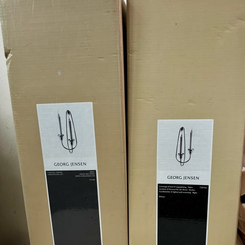 To væglysestager fra Georg Jensen (Swing) i stål med plads til to stearinlys hver. Monteres på væggen med de medfølgende ophæng. Fin stand. Prisen er for dem begge.