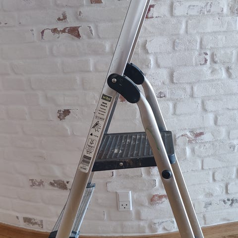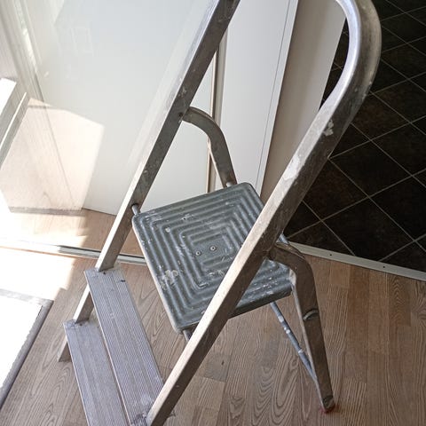 Alu trappestige med 4 trin og platform at stå på. Har bøjle øverst og skridsikre trin, nem at flytte rundt i haven eller huset.