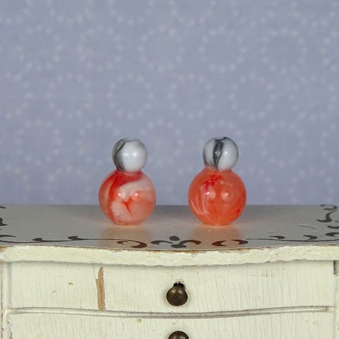 2 stk. miniature dukkehus parfumeflasker lavet af glas- og plasticperler.