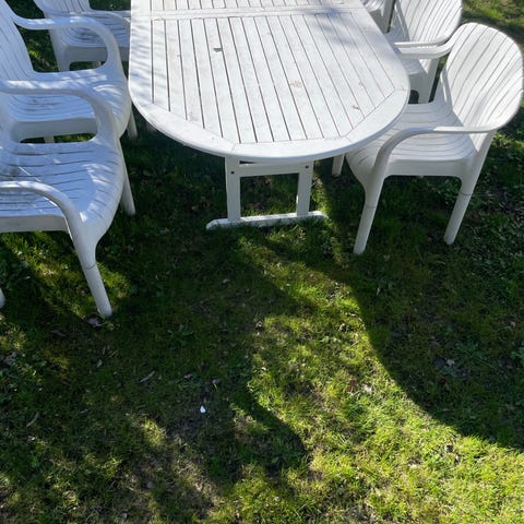 Hvidt havebord med 4 matchende stole sælges samlet. Bordet har hul i midten til parasol og stolene har armlæn og lameller i sædet. Meget let og skal bare have en klud.. ingen rust ..