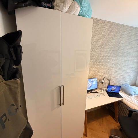 Stort Ikeaskab, som ikke længere er i brug. Vi tror alle dele er der men er ikke helt sikre. Skabet er gråt og hvidt.