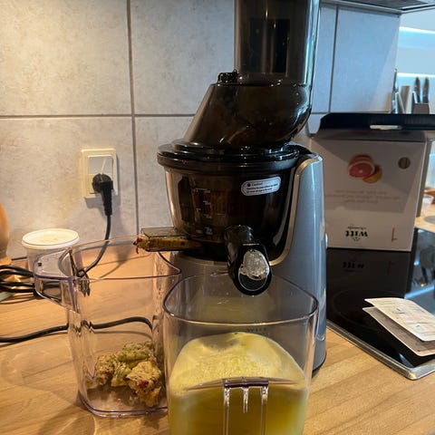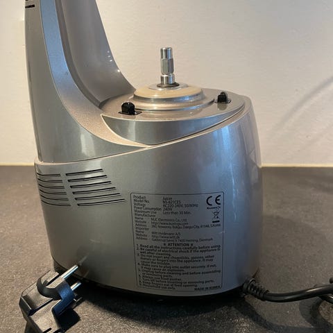 Witt saftpresser i sølv med stor påfyldningstragt og enkel knap på siden. Medfølgende dele som si, beholder og rensebørste ses på billederne.