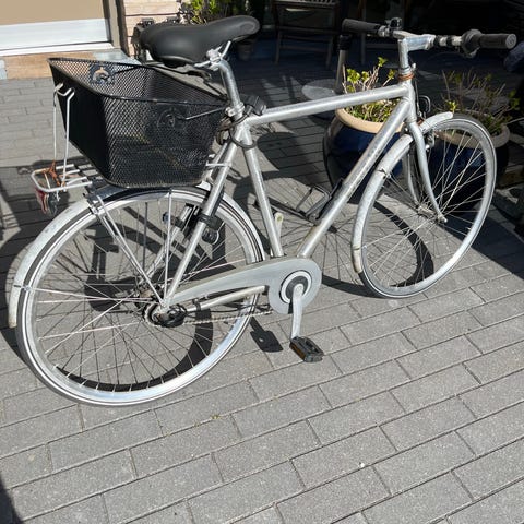 Centurion hybridcykel i sølv med 28" hjul og stel i str M, unisex model. Har bagagebærer, støtteben, drejegreb til gear og to håndbremser. Krans skiftet for nyligt.