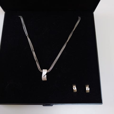 Smykkesæt fra Skagen i stål med perler, består af halskæde med to vedhæng og matchende ørestikker. Enkelt design med perledetaljer.