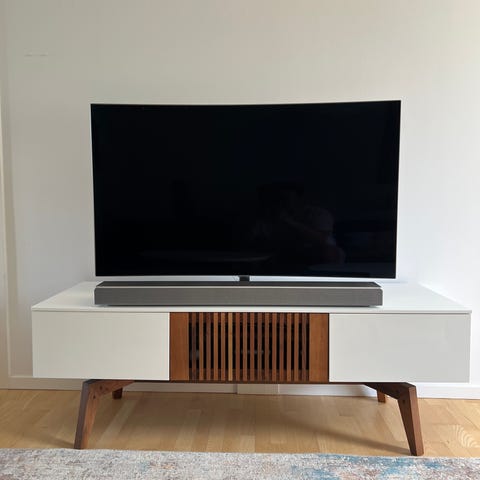 Tv-møbel / lav skænk i moderne design med grå højglans fronter og hvid ramme. Møblet har et stilrent udtryk og gode opbevaringsmuligheder. Velegnet til stue eller tv-område.