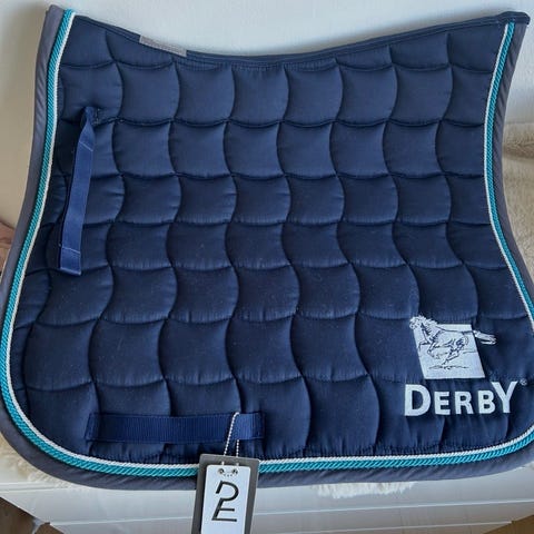Hvidt Equiline dressurunderlag med kviltet mønster og blå kant. Har stropper til gjorden og sadlen samt lille logo i hjørnet.