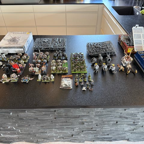 Helt sæt af samlede Ironjawz Bigmob til Warhammer spearhead, inkl. en masse ekstra ting (maling, spray, lim, skulls, pensler).