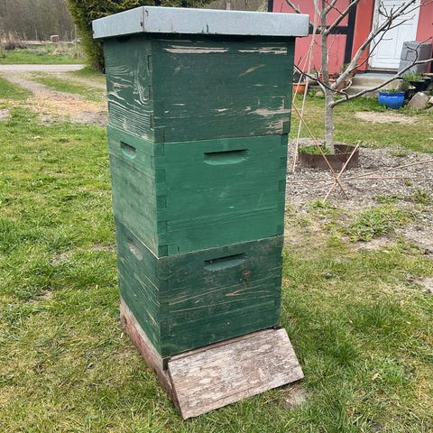 Trugstade i træ med fast tag og lille flyvesprække foran. Indvendigt er der trådbund og flere trerammer klar til brug.
