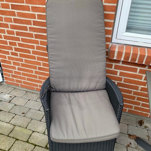 6 Beige havehynder til stole med høj ryg. Hynder har nakkepude. Hynder har bindebånd i siderne, så de kan fastgøres til stolen. Hynder kan vaskes i maskinen. Er brugte med ellers god stand.