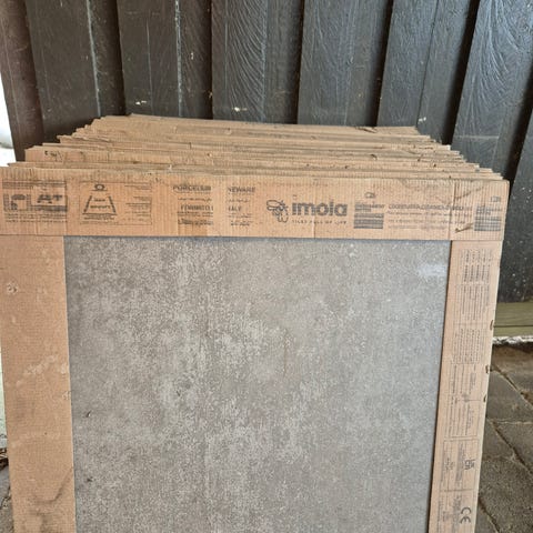 Italienske fliser. Ubrugt. Har stået i skur. Ca 7 pakker a 28 stk. Den øverste i en af pakkerne er revnet. Gratis slæb selv
