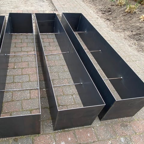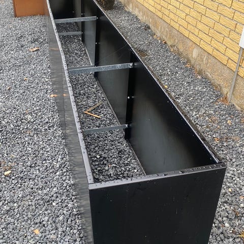Store sorte plantekasser i plast materiale, gode til bede eller krydderurter. Har rektangulær form med glatte sider og drænhuller i bunden.