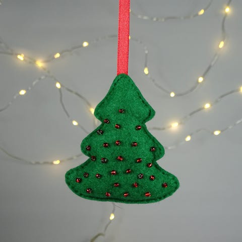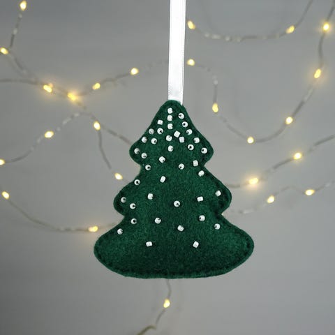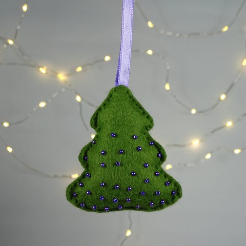 Håndlavet af snehvid filt med matte perlemorsfarvede pailletter, som holdes fast af glasperler. Hænger i blankt satinbånd. Fyldt med syntetisk fyld.