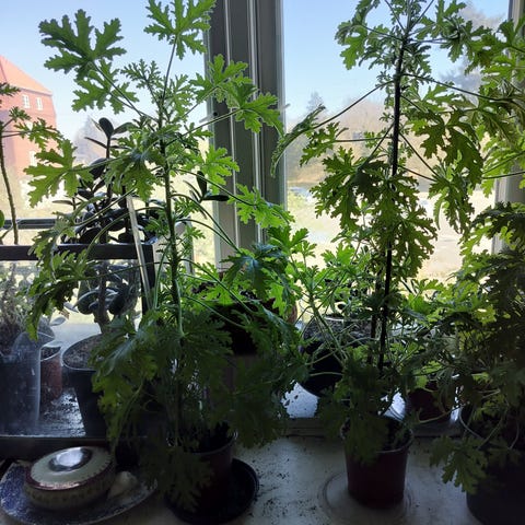 Jeg sælger denne opstammede duftgeranie med plastik krukke, som kan stå udendørs om sommeren.