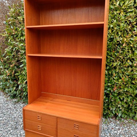 Flot og rummelig teak-reol med skydelåger og rummeligt design.