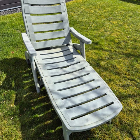 Hvid plast solseng med justerbart ryglæn og armlæn. Har hjul bagpå og lang hynde med ternet mønster.