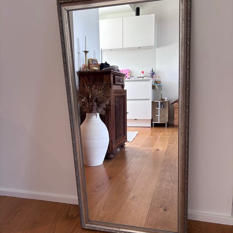 Flot vægspejl med guldfarvet ramme sælges. Klassisk og elegant design, som passer godt til entré, soveværelse eller stue. Fremstår pænt.