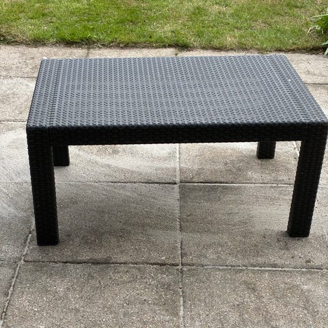 Fint havebord fra Jysk i beige flet med planker på bordpladen. Står stabilt og passer godt til en terrasse eller altan.