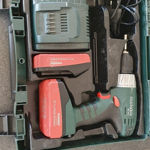 Metabo PowerMaxx BS Basic akku boremaskine i grøn plastkuffert. Der er plads til oplader og batterier i kufferten samt rum til bits og småting. Helt ny med to batterier