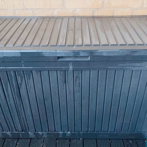Stor grå plast opbevaringsboks til haven eller terrassen med låg, der kan åbnes helt op. God plads indeni og kan låses med hængelås foran.