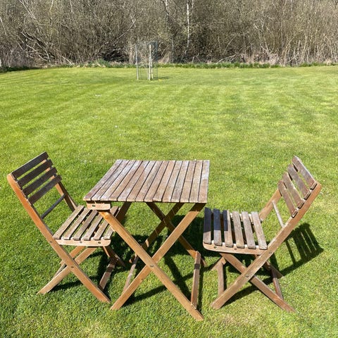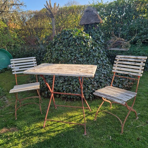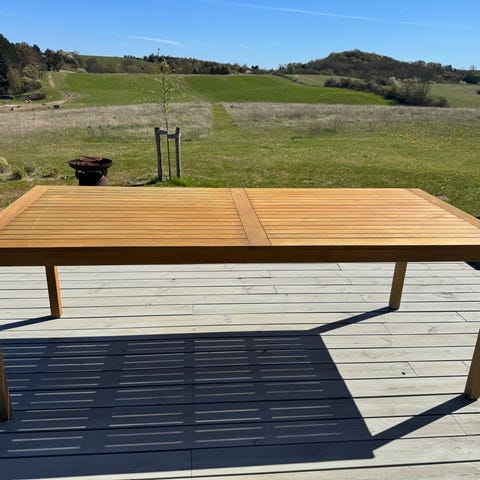 Teak havemøbelsæt bord og 2 stole i solid stabil kvalitet. FSC-certificeret. Bordplade 75x120. Skal have en rens. Stået under halvtag. Bud velkomne.