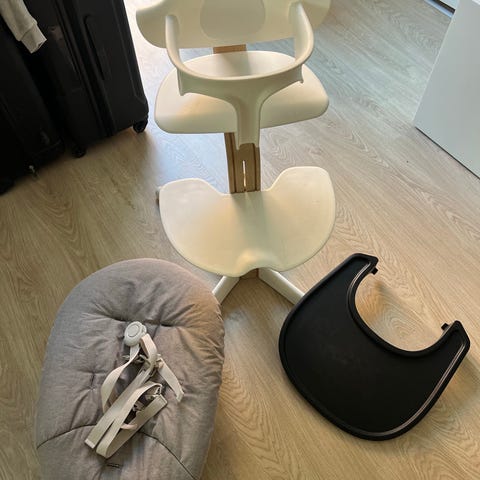 Stokke Nomi højstol i træ med hvid plast og grå polstret sæde. Med bøjle, sele og babyindsats som kan justeres på stolen.