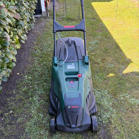 Bosch UniversalRotak 36-550 plæneklipper i grøn med opsamler bagpå. Håndtaget kan justeres. Højdejustering er defekt men kan kontrolleres med lidt kreativ brug af små klodser da plastik anordning er knækket. Medfølger uden batteri.