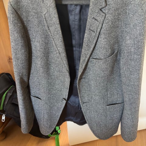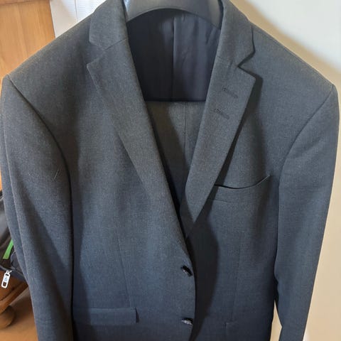 Tropical wool. Dejlig behagelig jakkesæt i blå farve. Brugt men i ok stand. Str M (48)
