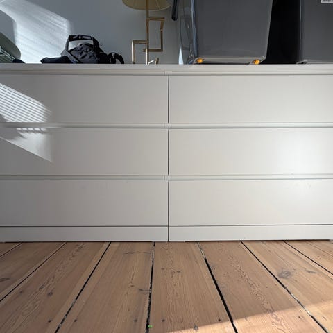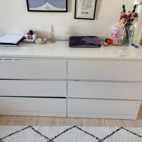 Hvid IKEA kommode med 6 skuffer og en glat hvid topplade, der giver god opbevaringsplads.