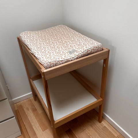 IKEA puslebord med to skuffer og en åben hylde til opbevaring af bleer osv.