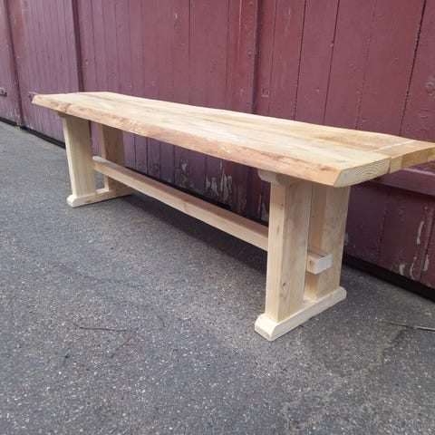 Rustikt træbord/bænk med enkel hylde under til opbevaring. Lavet af grove brædder med synlige samlinger, giver et råt og enkelt udtryk.