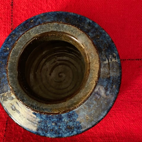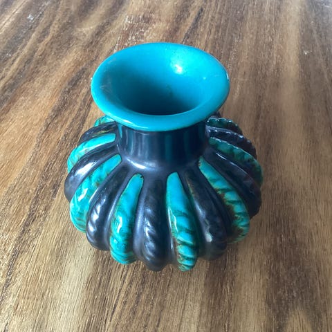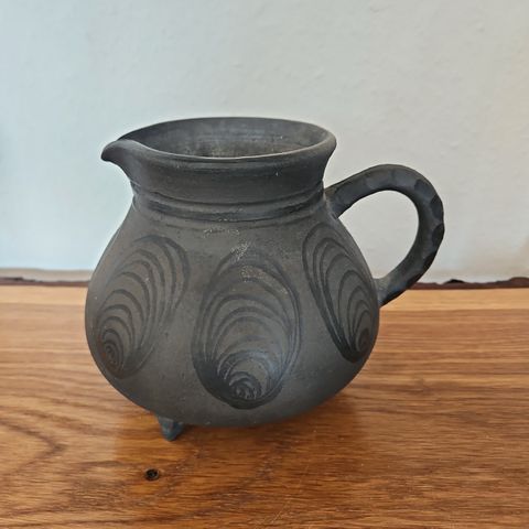 Kandeformet vase i sort - delvis mat glasur med bregneagtig dekoration. Fremstillet af Michael Andersen, Bornholmsk keramik modelnummer 3916. Højde 19,5cm og diameter 7,5 (bund) 10cm (top). Hel og fin.