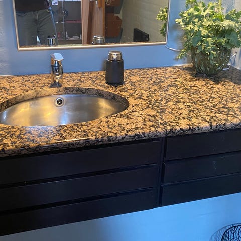 Hvidt badeværelsesmøbel med bordplade, indbygget vask og flere skuffer og skabe. Der er stort spejl med lys foroven og to skabe ved siden af spejlet.