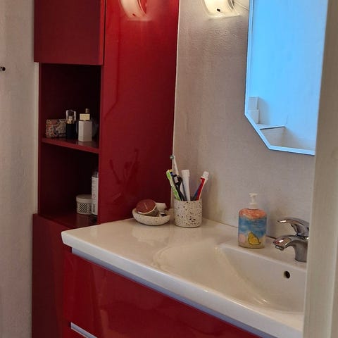 Hvidt badeværelsesmøbel med vask og spejlskab