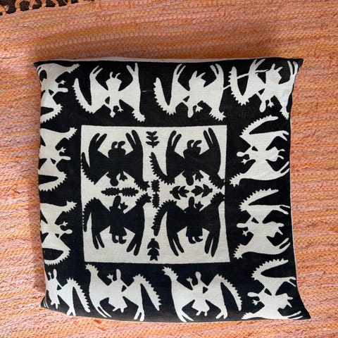 Fin pyntepude med broderet blomstermotiv på forsiden.