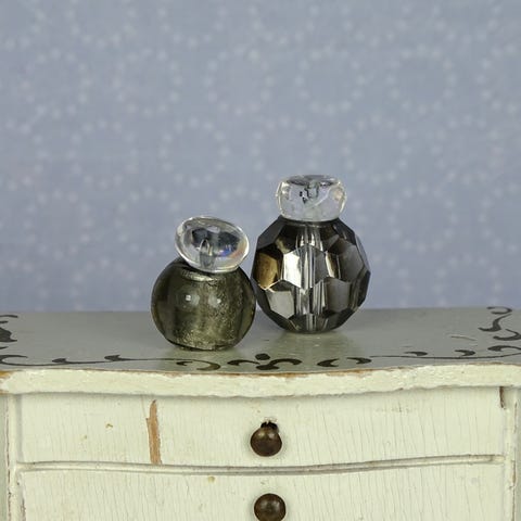2 stk. miniature dukkehus parfumeflasker lavet af glasperler.