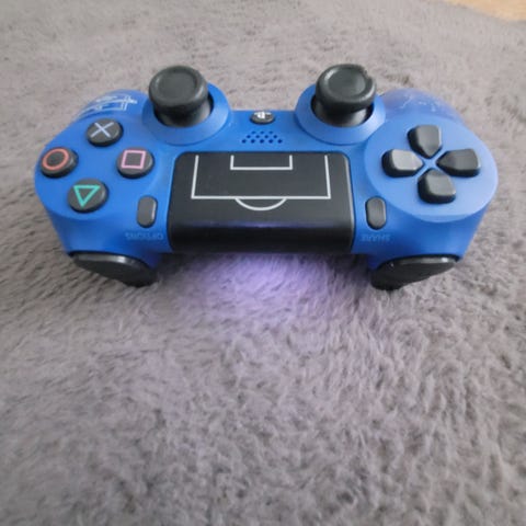 To originale Sony PS4 DualShock controllere, én sort og én blå. Med bord-ladestation og strømstik, så de kan stå og lade sammen.