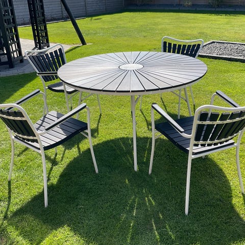 Rundt Marguerite havebord med 2 havestole i træ og metal