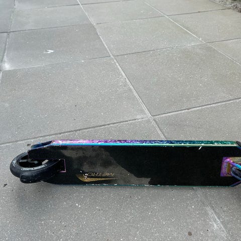 Panda trick løbehjul med sort styr og grøn deck med panda-logo. Har små hjul, metalgaffel og griptape på ståfladen.