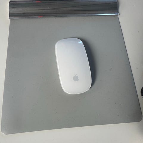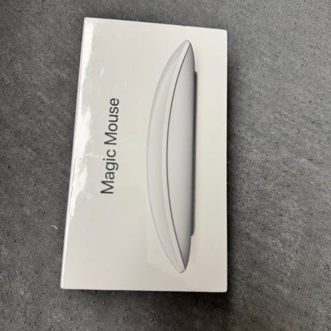 Apple Mighty Mouse model MB111Z/A i hvid med rullefelt på toppen. Har knap og skydeknap i bunden samt optisk sensor, og ligger i original æske.