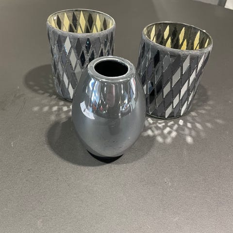 Herstal fyrfadsstager i metal, sæt med tre i forskellige højder. Har trekantet form og plads til ét fyrfadslys i hver.