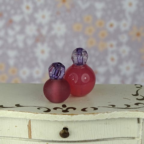 2 stk. miniature dukkehus parfumeflasker lavet af glas- og plasticperler.