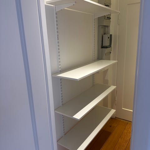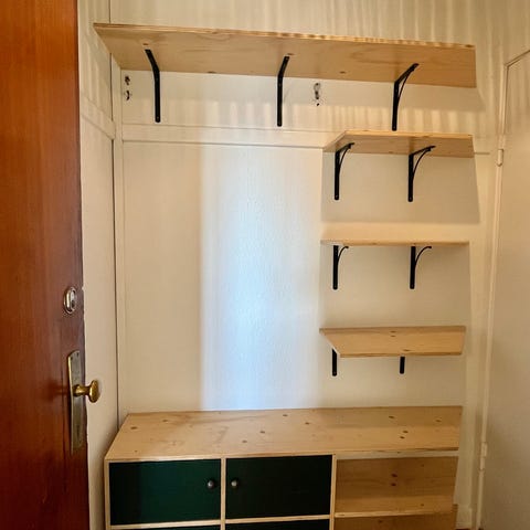 Reolen er monteret i loftet. Højden på sidestængerne er fleksibel. Reolen står i et rum med 230 til loft